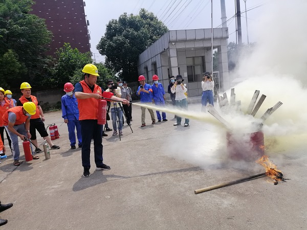 会后,全体参会人员前往湖南长青润慷宝农化有限公司进行消防演练。全体演练人员分为通信联络、疏散引导、现场救护、灭火行动、物资供应保障等5个小组,在应急工作小组的指挥下,对模拟因电器负荷用电导致的火灾事故进行了应急疏散和灭火实操演练。