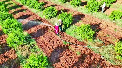 日前,在江西省樟树市义成镇,果农冒着酷暑给果树和药材树浇水“解渴”。兰海摄/光明图片
